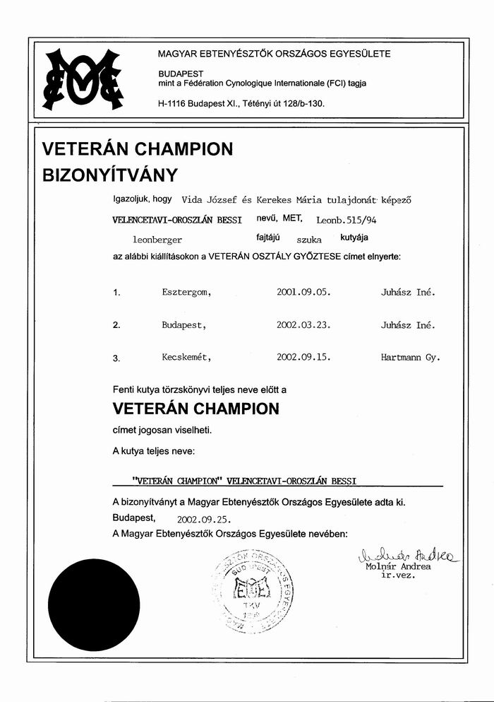 Sissy maga is Hungária Champion, sőt Veterán Champion,