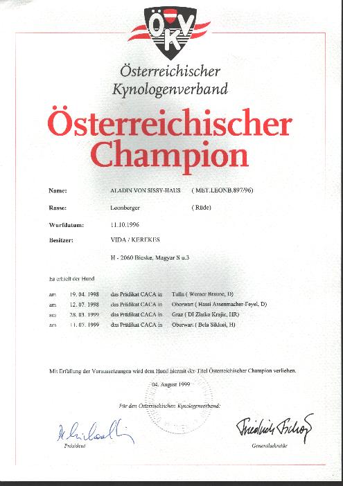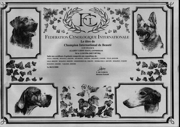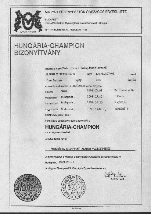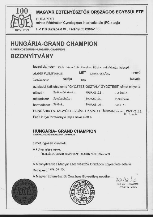 Hungária Grand Champion, Veteran Champion Velencetavi-Oroszlán Bessy "Sissy" (Benka v. Löwengarten x Kiserdei Juno) HD-A