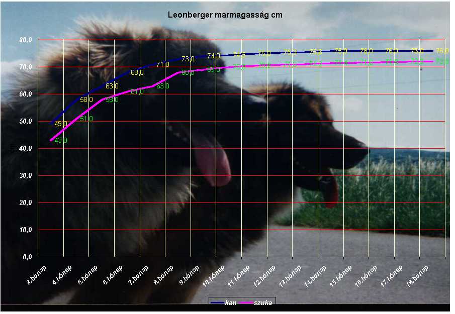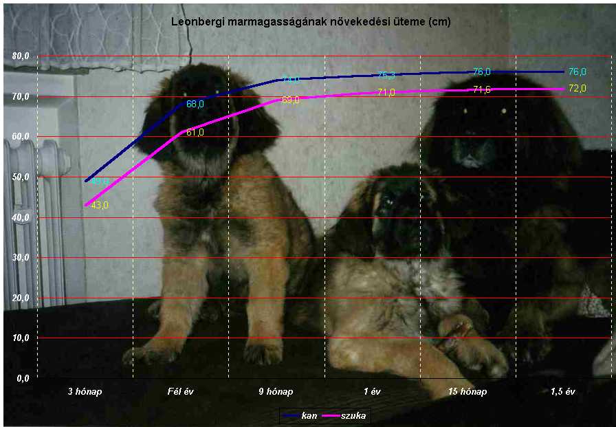 Megpróbálom a saját tapasztalatom és a szakirodalom segítségével bemutatni a leonbergi kutyák növekedését. A feltüntett adatoktól való jelentős eltérés nem tesz jót a kutyának, késöbbiek során hátrányok tapasztalhatók a túl elhízott, vagy éppen a nem megfelelően táplált kutyák esetén.