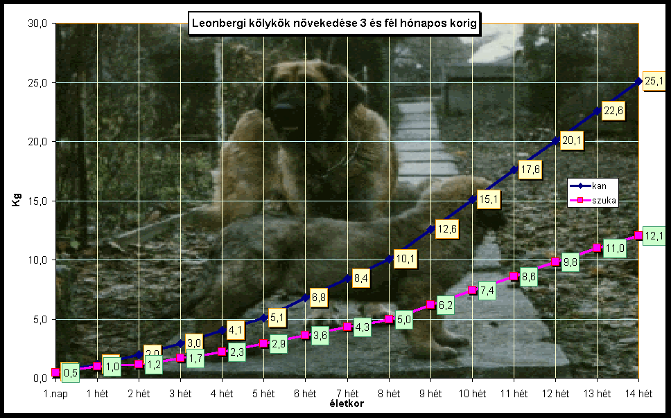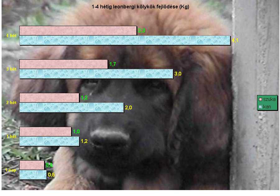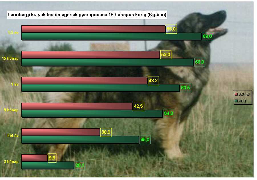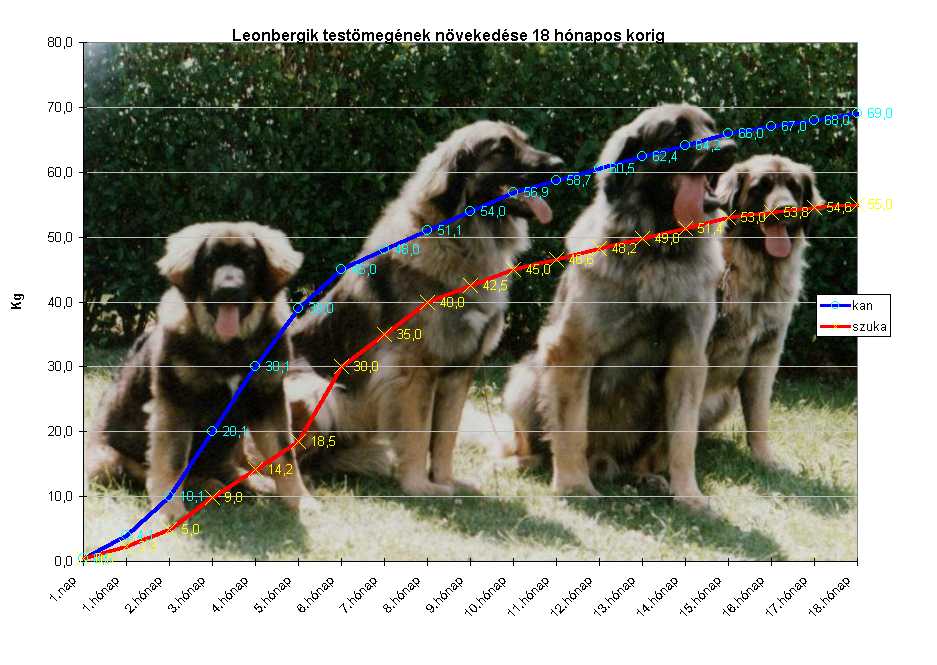 Megpróbálom a saját tapasztalatom és a szakirodalom segítségével bemutatni a leonbergi kutyák növekedését. A feltüntett adatoktól való jelentős eltérés nem tesz jót a kutyának, késöbbiek során hátrányok tapasztalhatók a túl elhízott, vagy éppen a nem megfelelően táplált kutyák esetén.