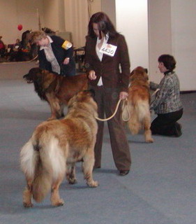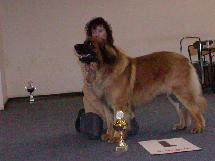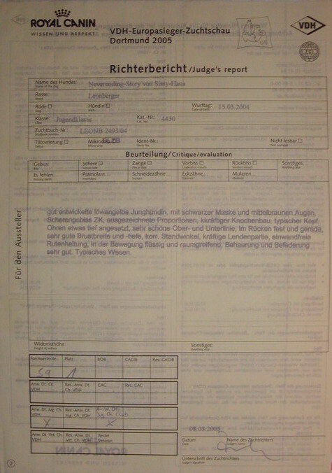 gut entwickelt löwengelbe Hündin, mit schwarzer Maske und mittelbraunen Augen. Scherengebiss ZK, ausgezeichnete Proportionen, kräftiger Knochenbau, typischer Kopf, Ohren etwas tief angesetzt, sehr schöne obere- u. untere Linie, im Rücken fest und gerade, sehr gute Brusbreite und Tiefe, korr. Standwinkel, kräftige Lendenpartie, einwandfreie Rutenhaltung, in der Bewegung flüssig und raumgreifend, Behaarung, Befederung sehr gut. Typisches Wesen.