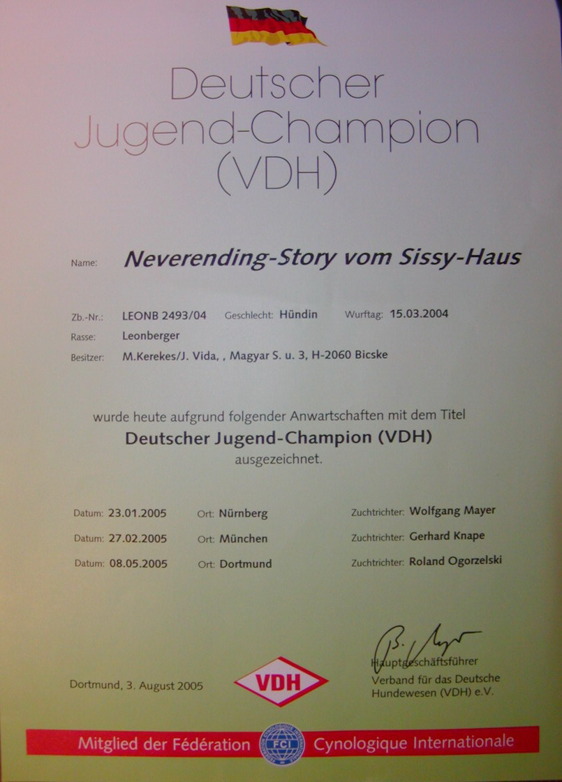 | 2005 Nürnberg CACIB | Jugendklasse | Sehr Gut 1 ,Jugendsieger | Wolfgang Mayer (D) | |